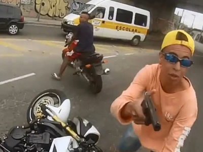A vítima postou um vídeo na internet mostrando a tentativa de roubo a uma motocicleta no sábado (12) e a ação de um policial que evitou o crime ao atirar no criminoso. As imagens foram registradas por uma câmera instalada no capacete do motociclista, que é segurança.