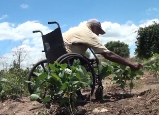 Mesmo com muita dificuldade de locomoção, o agricultor pega uma enxada e uma foice para cuidar do plantio de milho e feijão. Contudo a cadeira de rodas utilizada pelo Sr. Gerônimo não está suportando o ritmo de trabalho e está bastante deteriorada. Durante a reportagem ele, inclusive, fez um apelo para que alguém possa realizar uma doação deste equipamento para poder desempenhar seu ofício de forma um pouco mais confortável.