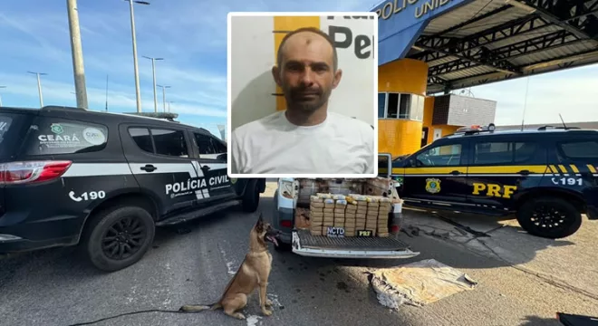 Um homem foi preso e grande quantidade de drogas apreendida numa operação que reuniu policiais civis de Juazeiro e agentes da Polícia Rodoviária Federal (PRF). Foi na tarde desta terça-feira (6) na BR-116 no Distrito de Cascudo na zona rural de Icó. Os policiais prenderam Francisco Olímpio Cavalcante Filho, de 37 anos, residente em São Bento (PB) e apreenderam 64,843 quilos de drogas, sendo 6 Kg de cocaína e mais 58 Kg de crack. A droga foi descoberta pelo cão farejador da Polícia Civil.