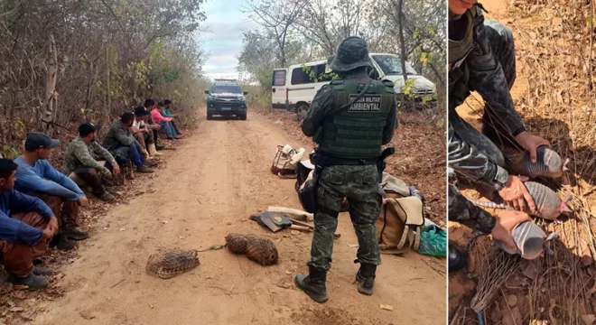 Um torneio de caça ilegal de animais silvestres foi desarticulado na madrugada deste domingo (10) pela Polícia do Meio Ambiente no Cariri. Foi por volta das 4 horas no Sitio Bom Lugar na zona rural de Lavras da Mangabeira quando, oito pessoas foram presas e diversos animais resgatados por militares do BPMA (Batalhão de Polícia do Meio Ambiente). Eles estavam com quatro Tatu-galinhas vivos e aprisionados em redes e dois cães utilizados na caça.